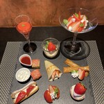 そのほかの素材はルッコラのジェラート、イチゴ型のいちごムース、フランボワーズあめ、フランボワーズクラックラン、ブラケットダックイジュレ、すみれとベリーのガナッシュソース、いちごシトラスジャム、マスカルポーネフロマージュブランクリーム、いちごバルサミコハーブマリネ、レモンジュレ、イチゴコンポート。