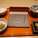 感染予防対策を前提に、料理は一人ひとりに豆皿を中心に取り分けた状態で提供する。店内は、ライブ感のあるオープンキッチンのL字カウンター席と、落ち着きのある2つの個室を用意しているので、シーンに合わせて使い分けて。
