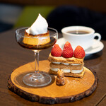 こちらで味わえるミルフィーユは、パイ生地とスポンジで特製カスタードと大粒の博多あまおうをサンド。ボリュームたっぷりのナポレオンパイです。