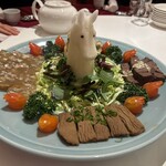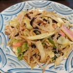 当時はエビやイカが入っておらず、海産物が原料の蒲鉾や天ぷらなどが主な具材だったそう。現在「福建炒麺・博多皿うどん」1,320円として提供されているメニューは、考案当時の調理法や具材を用いた復刻の味です。博多の老舗「西門蒲鉾本店」の紅白蒲鉾と角天、豚肉、キャベツ、モヤシなどの野菜を炒め、自慢のスープを加えてひと煮立ち。そこへ焼き固めた麺を投入し、スープがなくなるまで麺を煮込んだら完成です。