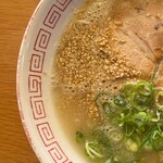 博多豚骨らしいパンチととろみがあり、かつ臭みのないスープ。最初からゴマが振りかけられているので、“なし”がいい人は、麺の硬さと共にオーダー時に。「ラーメン」550円とコスパ優秀。