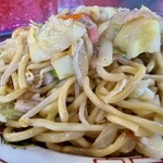 博多名物の「焼きラーメン」と同じように少量の豚骨スープが隠し味。ラードも炒め絡めることで、より香ばしくねっとり濃厚な味わいに。太麺としっかりと絡んで、これはうまい!!