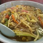 キャベツやカマボコ、イカゲソなど具沢山の「皿うどん(太麺)」850円。ラーメン、みそラーメンに次ぐ3番手のメニューであるが、これしか頼まない常連も多いという。