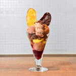 トップはチョコレートと白あんを合わせたペーストで、中にはゴロゴロとした栗を混ぜた、香ばしいナッツのような風味のアイスクリームが隠れています。土台は、チョコレートのペーストとチップを練り込み、栗をまるごと一粒のせて焼き上げたもの。