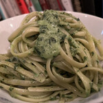 ここに来たなら、まずは食べてみたい名物が、ご覧の写真上の一品「リングイネ 超すり立てジェノヴェーゼ」1,200円だ。すり立てというように、ジェノヴェーゼソースは作り置きをせず、注文が入ってからにんにく、松の実をすり鉢に投入。軽く潰してからバジルをちぎって加え、力いっぱいすり混ぜる。この間、狭い店内に充満するバジルの香りが実に爽快! その様子を客席で見せるパフォーマンスも楽しみだ。