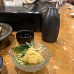 ウニとクレソンを海苔で巻いて食べるという、お酒も進むし野菜も摂れる、贅沢なお料理。さらに残った汁に酢飯を入れてもらうと2段階で楽しめます。