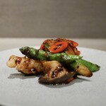 スパイスとともに炒って砕いた米に、白腐乳(豆腐を塩漬けにして発酵させ麹に漬けたもの)とジャオマー(山椒とねぎを合わせたもの)などを加え、それをからめて蒸し上げたもの。スパイシーだが辛味はなく、ロゼワインともぴったり。