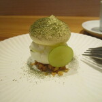 続いて登場した洋のデザートも、完成度が高い。ココナッツサブレのクランチにヨーグルトのアイスやシャインマスカットを重ね、その上にレモンソースのエスプーマをふわり。散らしたレモンバーベナのパウダーも実に爽やかだ。とりどりに広がる甘味、酸味、食感の変化が楽しい。