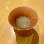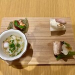 約1週間寝かせ、皮目をサッと炙った鰆は、凝縮された旨みと脂の甘みがたまらない。赤貝は軽く低温調理し、ほの温かい状態で提供。低温調理することで特有のにおいを抑え、甘みを引き出す狙いだ。ヤマトモさんが「香り爆弾!」と称した通り、噛んだ瞬間に弾ける木の芽と磯の香りの調和が素晴らしい。