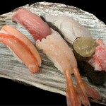 日替わりの「おすすめ5貫盛り」はかなり大ぶりな寿司ダネの存在感が際立つ。特に香箱がに(写真右端)の爆発具合が素晴らしい。これだけでも十分なボリュームだ。