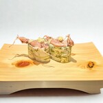 こちらはなんとも目を引く一皿。いくらの昆布〆というのも珍しいが、さらにおぼろ昆布で巻くというアイディアが秀逸。いくらの旨味がぐっと伝わってくる。ちなみにこちらのガリには昆布が入っているのが特徴で、お土産にも人気。あらゆるところでとにかく昆布がいい仕事をしている。