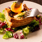 合わせているソースは仔牛のフォンドボーにオリーブオイル、さらにチーズとパクチーを散らしていて、あっさりした味付けながらも様々な風味が感じられます。これは肉好きだったら、一度は味わってほしい一皿。