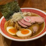 こちらはつけ麺とは一転して鶏清湯のラーメン。鶏の旨みをストレートに味わえるラーメンとなっています。ナルトやメンマなど基本を押さえつつ、鴨チャーシューものってくる贅沢な一杯です。