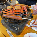 「かに小屋」の松葉ガニは網からはみ出るほど大ぶりだ。そのまま焼くのは難しく、まずはハサミで足を切り落とす。甲羅をはぎ取り、エラをはずすなど手順はあるが、写真付きの分かりやすい説明書きがあるので迷うこともない。鮮度が最もよい状態で浜茹でされているため、軽く炙るだけでベストな食べ頃だ。