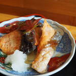 焼いたサーモンを醤油ベースのタレに漬け込んだ焼き漬けは、ご飯が進む味。定食のご飯は大盛り+50円、おかわり100円。