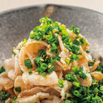 とりあえずの一品として人気の「柔らか牛すもつ」759円。豚のモツで作ることが多いのですが、こちらでは牛の大腸を使用。クセがなく食べやすいのに加え、筋張った硬さも感じず、柔らかいのが特徴です。九州産カボスやユズで爽やかに仕上げた特製ポン酢が相性抜群。ピリッと辛味の利いた柚子胡椒を付けるのが博多流の食べ方。