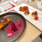 真っ赤なビジュアルが目を引く「紅色“肉寿司”恵方巻」1本 1,950円は、海苔の代わりにマリネした紅くるり大根で巻いた恵方巻。ビーツで炊き上げた酢飯に、甘辛く煮立てた国産牛のしぐれ煮と北海道産しほろ牛のローストビーフ、春菊、大葉、ミョウガの酢漬け、きゅうり、卵焼きなどの食材を合わせています。