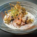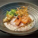 看板メニューの「白サーモン」930円は、サーモンの程良い塩気に人参エスプーマの自然な甘味を合わせたフレンチ気分に浸れる一杯。