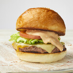ボリューム満点で、シンプルでありながら細部へのこだわりも見せるHamburGirlの「ハンバーガー」単品 1,100円。脂と肉の旨味を引き出した100%牛肉のパティに、手作りのオーロラソースを合わせ、バターのコクと酒種による酸味を加えた甘さ控えめのバンズでサンドしているのが特徴だ。