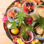 豪華な「デザート盛りあわせ」がそれで、定番のわらび餅をはじめココナッツプリンや栗ぜんざいなど常時6種がずらり。まるでデザート八寸とでも呼びたい艶やかさだ。中には、ドライフルーツのクリームチーズ和えなど食後酒を意識したものもあり、差し詰め大人のデザートといったところだろう。