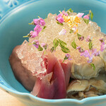 仕上げにも一捻り。最初から黄身酢で和えるのではなく、黄身酢は下に敷き、上からは土佐酢のジュレ餡をかけ、食べる際にはよくよく混ぜて召し上がれ!との趣向も、新鮮だ。