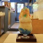 その名の通り、牛乳や乳製品をベースにバナナやリンゴ、ミカン、モモなどを組み合わせて撹拌させた、大阪名物のミックスジュースを再現したスイーツ。オーソドックスなカスタードプリン、イチゴプリン、ブルー&ピンクのリンゴのクラッシュゼリーを重ね、混ぜて食べるとミックスジュースの味わいが口いっぱいに広がる。