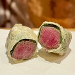 看板料理は、牛ヒレのなかでも厳選した部位のみを使用するシャトーブリアンの天ぷら。天ぷらの伝統に新しい風を吹かせる起爆剤になれば、と生み出した意欲作だ。