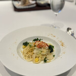 パスタは、桜の風味の利いたピンク色のタリオリーニ。メインディッシュには、イタリア産仔牛フィレ肉に生ハムをのせたサルティンボッカを。