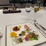 コースは、オリジナルカクテルの乾杯酒で始まり、前菜はプレートの上で花開く桜をイメージした一皿が登場。