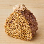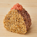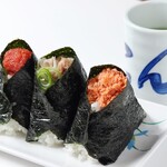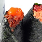 棚に並んでいるおにぎり以外は、注文を受けてから握ってくれます。具材は50種類以上あり、トッピングもできるので、組み合わせは無限大に楽しめます。「卵黄+肉そぼろ」380円や、「明太マヨ+焼きたらこ」380円など、組み合わせたおにぎりが人気のようです。