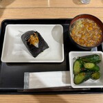 唐揚げ「戸越丸」2個とみそ汁、煮卵、お新香が付く「おにぎり2個セット」1,000円もあります。こだわりの具材を使い、米粒の立ったおにぎりは、ボリュームもあって食べ応えがあります。