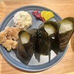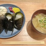 『おむすびセットは、おむすびと惣菜、お味噌汁がセットになっています。この日のお惣菜は和でしたね。レンコンひじきのきんぴら、ちくわの磯辺揚げ、茄子とピーマンの和え物、お漬物でした。お味噌汁は具だくさんでたくさん野菜が入っています。塩むすびは出来立てでシンプルながら美味しいですね。』(whoiskawakamiさん)