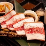 少量ずつ異なる部位を盛り合わせた様々なバリエーションのメニューは、一人焼肉にぴったり。「タンくらべ」は、コリコリとした食感の「タン先」、サシが入っておりしっかりした歯ごたえの「タン下」、柔らかくジューシーな「特上タン」の3種類の食べ比べができる。