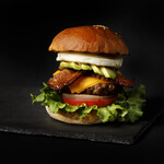 ブルーチーズはデンマーク産のダナブルー。ベーコンのポークもデンマーク産です。塩コショウ、ハーブ、メイプルシロップに1週間漬け込んだ豚バラ肉を半日かけて店内で燻製。その自家製ベーコンをガリッガリに焼いてパティの上へのせた一品です。その焼き込み方の容赦のなさ! 例えるならビーフジャーキーを炙ったぐらいのガリガリ加減で、これがブルーチーズと相性抜群! 両者混ざって突き抜けるような力強い味に。このバーガーも野菜なしでいいと思います。