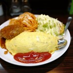 階段を上って2階にあるお店。店内はネパール人男性2人で切り盛りしています。シェフは町洋食の名店である新橋「むさしや」出身。8年間勤めたそうで、むさしやでインド風カレーがメニューに加わったのもこちらのシェフの力によるところが大きいのでしょう。そのシェフの幼馴染みが主に接客担当。兄弟のような関係性だそうです。メニューはむさしやと同じようにオムライス、カレー、スパゲッティの三本柱。