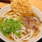 うどんバージョンもある「三ツ矢そば」570円は、天ぷら、肉、きつねをトッピングしたボリューム満点の一品。もともとこちらは、安芸高田の道の駅内にある系列店で提供しているもの。非常に人気のため、逆輸入というかたちで、こちらでも出すようになったのだそう。安芸高田と言えば、武将・毛利元就に所縁のある地。商品名はもちろん、「三本の矢」にちなんで付けられています。