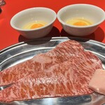 色味の鮮やかな肉を網の上で焼き音を響かせる、これが至福の瞬間です。醤油ベースの自家製ダレや刻みニンニクを使った薬味のほか、生卵とタレでプルコギ風に仕上げるロースなど、肉とタレの斬新な組み合わせも楽しい!