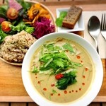 ちなみに、上質な食材ばかりを使った日替わりランチメニューも好評です。この日は大豆ミートの中華風炒め、レンコンとスナップエンドウのナポリタン炒め、紫キャベツのラペなど、彩り豊かで生野菜も大盛りでした。玄米または米粉パンが選べるほか、主菜はヘルシーな肉料理もセレクトできます。乾物からエキスを抽出した、ヴィーガン対応の自家製味噌玉のスープなど追加オプションも豊富。その日の気分やお腹の調子に合わせ、体に取り入れるものを選べる柔軟さが良いですよね。