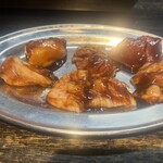 久留米の畜産センターへ毎朝足を運び、店主自ら吟味して仕入れる和牛ホルモンの料理が自慢。名物の「焼きもつ」は、味噌ベースの特製ダレを絡めたホルモンをオリジナルの鉄鍋で焼き上げる逸品です。モツに一味をちょいっと付けて頬張れば、食感プリプリ、うま味がじゅわり! 甘辛いタレやタマネギの甘味も相まってたまらないおいしさです。