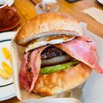 店主・佐藤さんのお気に入りは「ベーコンエッグバーガー」にチェダーチーズとハラペーニョのトッピング。よその店へ行くとき、佐藤さんはいつもこの組み合わせで食べるそうです。私も頼んでみました。中身の「圧」がすごいバーガーです。挟まる具材から弾けるばかりの強い「出力」が感じられます。その調整役がバンズ。直径12cmのちょっと大きめサイズの全粒粉バンズですが、オーブンでしっかりトーストして表皮がシャリシャリ。レタスのサクサクとともに、上下から食感を利かせて「カチッ」とした輪郭をハンバーガーに与えています。