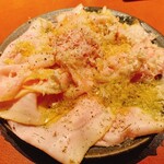 「鴨肉のたたき」は、ラーメンのチャーシューに用いる鴨ロース肉を活用したもの。香ばしく、そしてほどよく火入れした鴨肉のたたきをゴマ油と塩でいただくもので、噛むほどに鴨のうまみが口の中に染み渡っていく。