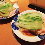 豚肉使用の小皿料理は「岩中豚の焼売」「山形豚のロース叉焼と山わさび」ときて、次にくるのが「もち豚の雲白肉(ウンパイロウ)」で、それぞれの銘柄の持ち味を生かした料理に仕立てている。雲白豚はスライスキュウリが立体的に盛られており、何と見た目の華やかなこと。