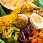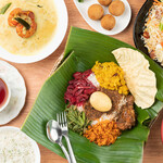 ランチの「ランプライス」(1,650円)は、バナナの葉を開くと香りの良いバスマティライスの上に、チキンカレーやフライドエッグ、レンズ豆のカレー、メレーピクルスなど、色々なおかずが盛りだくさんにのっていて、どこから食べ進めるか迷ってしまいそう。25種類のスパイスを使っているため、味もバリエーションに富んでいて、最後までおいしく堪能できます。