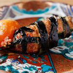 やきとん大地の名物だった、まくら(つくね)はこちらにもあります。軟骨を叩いて入れてあるつくねをニラで巻き、串の先にキンカン(未成熟卵)を付けた、実に手間のかかった一本。