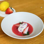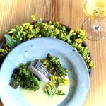 4品目は「さくらさくら」に「穏 生酛純米 しぼりたて中汲み生」。さくらさくらと名付けられた一品は、酒かすで作ったスープだ。穏 生酛純米の蔵元である仁井田本家の酒かすと玉ねぎをじっくり煮込み、鯛と白しめじを加えている。1711年に創業した仁井田本家のシンボルでもある桜と、季節の桜鯛を合わせるという発想からの料理だという。
