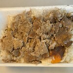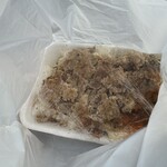 炊きたてのふりかけご飯に特製ミンチカツをのせたミンチカツライス。食べ盛りの学生さんの朝ごはんにも人気だそうで、テイクアウトが可能。専用の持ち帰りトレイにのせてくれます。肉玉ライスと同じように3種類の中から好みの味付けを注文。写真はだし醤油。