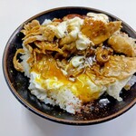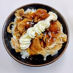 広島ではおなじみのふりかけ「旅行の友」をふりかけたふっくら炊きたてのご飯に、鉄板で焼いた半熟の玉子と専用の重しを使ってしっかり焼いた豚もも肉をオン。創業当時から変わらないセンナリソースをたっぷりかけて、マヨネーズを1本ラインのように引くと「肉玉ライス」の完成です。