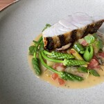 ディナーの前菜はフルコースらしく3品。冷菜が2品続いて、最後が温前菜です。ある日は、甘味をより引き立てる、あっさりとしたアスパラガスのベニエに、レモン味しっかりのシトロンビネガーでしめた〆さばと雲丹、お豆のフリカッセ。アクセントとなる自家製のドライトマトがちゃんと役目を果たし、この一皿もワインが進みます。