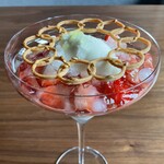 デザートは2種。この日のアヴァン デセールは、マンゴーのムースに軽く焼いたマンゴーの果肉、パッションフルーツを絡めたタピオカに、シャンパンのジュレ。その上にココナッツのソルベをのせて。