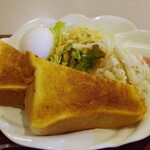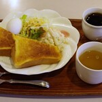まずは店名が付いた看板フード・モンブランセット(1,000円)。ハンバーグ、魚フライ、粗挽きウインナーと3つのメインが盛られた、ボリューム満点の一品です。ご飯の大盛りやみそ汁の追加はプラス100円で。ご飯の大盛りを「モンブラン盛り」と呼ぶのもユニークです。